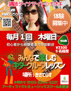 参加楽器はアコースティック、エレキどちらでも可能。ご自分の楽器があればお持ちください。