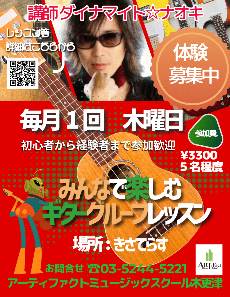 アーティファクトミュージックスクール御茶ノ水本校、木更津ルームのギター講師として、毎月約50以上のレッスンを実施する大人気講師。